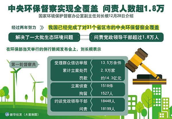 新華社北京12月28日電(記者高敬)國家環境保護督察辦公室副主任劉長根28日介紹,經過兩年努力,我國已經完成了對31個省區市的中央環保督察全覆蓋,解決了一大批生態環境問題,問責黨政領導干部超過1.8萬人。