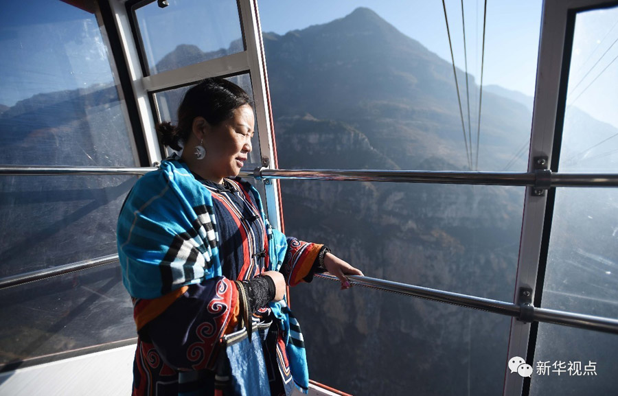 2017年2月16日,身為村黨支部書記的駱云蓮乘坐新修建的索道纜車去古路村六組調研。