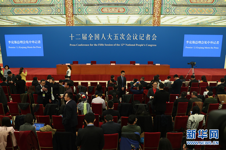 3月15日上午,國務院總理李克強在人民大會堂三樓金色大廳會見采訪十二屆全國人大五次會議的中外記者并回答記者提出的問題。圖為記者會現場。新華網/中國政府網 翟子赫 攝?
