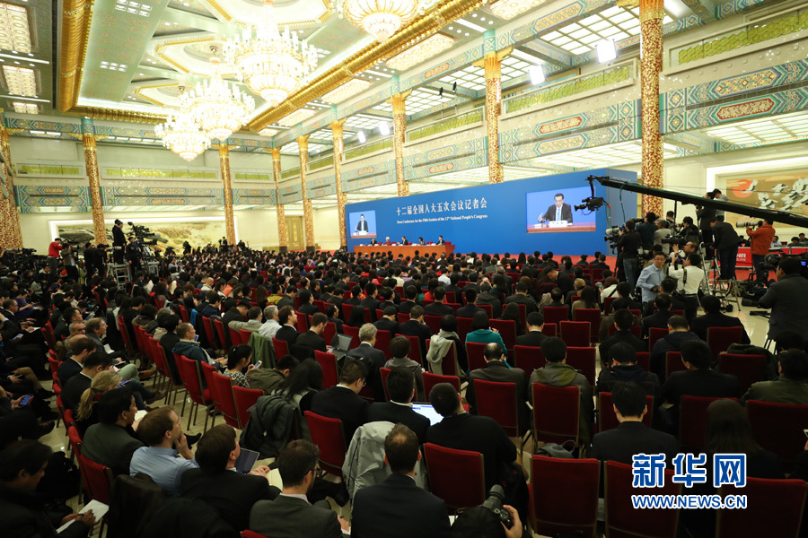 3月15日上午,國務院總理李克強在人民大會堂三樓金色大廳會見采訪十二屆全國人大五次會議的中外記者并回答記者提出的問題。圖為記者會現場。新華網/中國政府網 翟子赫 攝