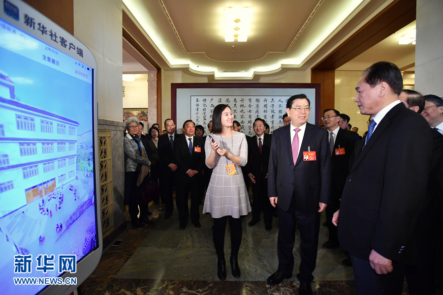 3月14日上午,中共中央政治局常委、全國(guó)人大常委會(huì)委員長(zhǎng)張德江在北京人民大會(huì)堂看望參加十二屆全國(guó)人大五次會(huì)議新聞報(bào)道工作的中央主要媒體負(fù)責(zé)人和工作人員,代表大會(huì)主席團(tuán)向所有參加人大會(huì)議報(bào)道的新聞工作者表示誠(chéng)摯慰問(wèn)和衷心感謝。這是新華社社長(zhǎng)蔡名照陪同張德江觀看新華社新聞產(chǎn)品演示。 新華社記者李濤攝