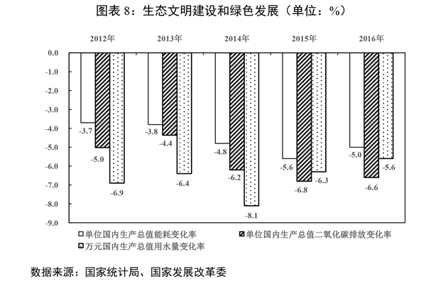 (七)加強生態環境保護和能源資源節約,綠色發展初見成效。單位國內生產總值能耗和二氧化碳排放量分別下降5%和6.6%,超額完成全年目標,化學需氧量、氨氮、二氧化硫、氮氧化物排放量預計分別下降2.6%、2.9%、5.6%、4.0%,地級及以上城市空氣質量優良天數比例同比提高2.1個百分點,74個重點城市細顆粒物(PM2.5)年均濃度下降9.1%,地表水達到或好于Ⅲ類水體比例同比提高1.8個百分點、劣Ⅴ類水體比例同比下降1.1個百分點,萬元國內生產總值用水量下降5.6%。