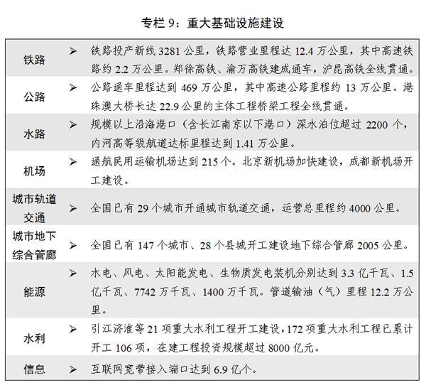 六是基礎設施網絡進一步完善。加快推進現代綜合交通運輸體系建設,交通基礎設施網絡總里程突破500萬公里。交通提質增效、扶貧脫貧、重大基礎設施建設“一二三百”工程出臺實施,推進多式聯運發展,促進通用航空業發展,推動交通物流融合發展。能源生產和消費革命戰略出臺,能源供應能力不斷增強,非化石能源消費比重預計上升到13.3%,煤炭消費比重下降到62.0%。全國地級市基本建成光網城市,新一代信息基礎設施更加完善,建成全球最大的4G網絡。