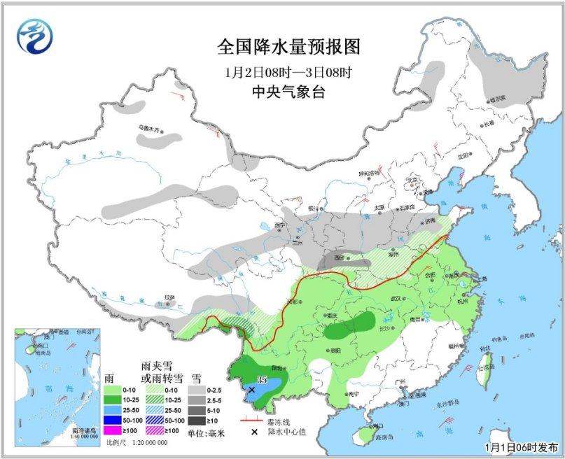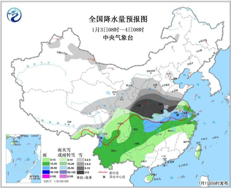 中央氣象臺1日清晨發布天氣公報,今日全國范圍降水較弱,2日至4日中國中東部將出現大范圍雨雪天氣。