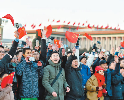 “五星紅旗你是我的驕傲,五星紅旗我為你自豪,為你歡呼我為你祝福,你的名字比我生命更重要……”天安門廣場的新年首個升旗儀式吸引了全國人民的目光。2018年1月1日清晨,來自全國各地的數(shù)萬名群眾自發(fā)來到天安門廣場,期盼著與即將升起的五星紅旗共同沐浴新年的第一縷陽光。
