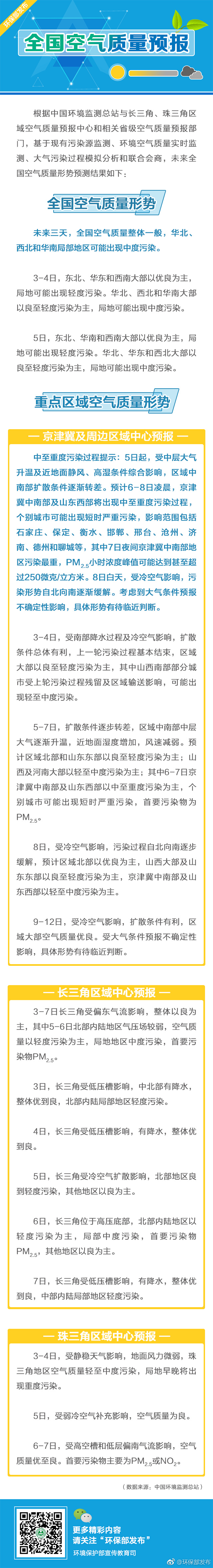 據(jù)環(huán)境保護(hù)部宣傳教育司官方微博消息,未來三天(1月3日-5日),全國空氣質(zhì)量整體一般,華北、西北和華南局部地區(qū)可能出現(xiàn)中度污染。5日起,京津冀及周邊區(qū)域中南部擴(kuò)散條件逐漸轉(zhuǎn)差。預(yù)計(jì)6-8日凌晨,京津冀中南部及山東西部將出現(xiàn)中至重度污染過程,個(gè)別城市可能出現(xiàn)短時(shí)嚴(yán)重污染,其中7日夜間中南部地區(qū)污染最重。8日白天,受冷空氣影響,污染形勢自北向南逐漸緩解。