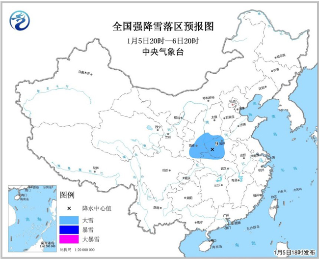 中央氣象臺1月5日18時再次發布暴雪藍色預警。