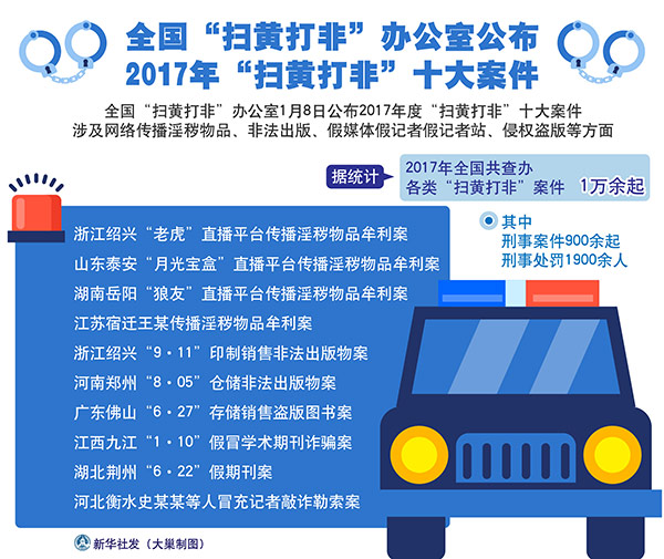 圖表:全國“掃黃打非”辦公室公布2017年“掃黃打非”十大案件 新華社發 大巢制圖