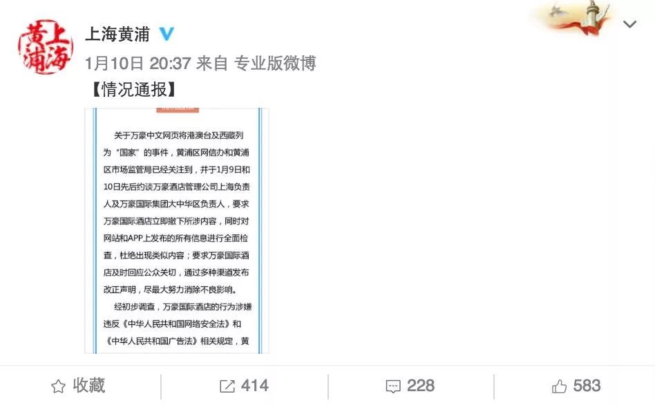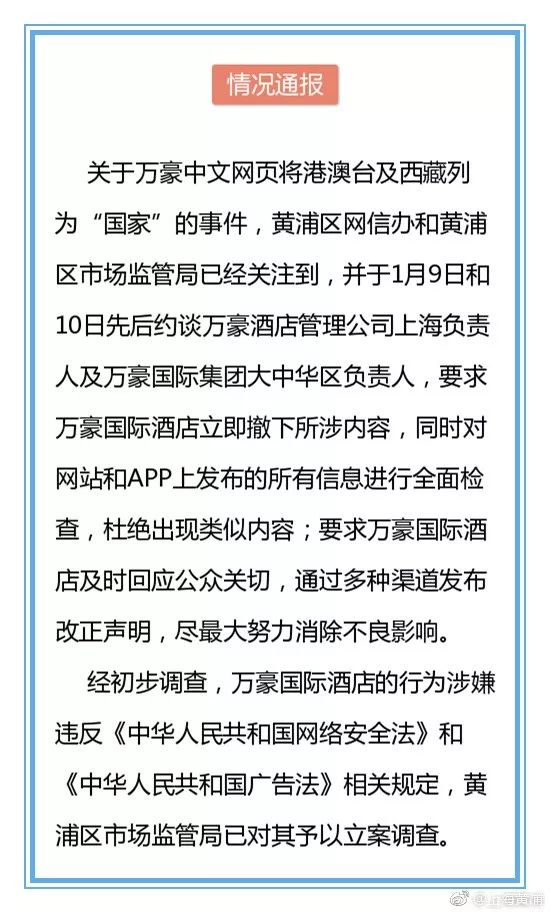 經初步調查,萬豪國際酒店的行為,涉嫌違反《中華人民共和國網絡安全法》和《中華人民共和國廣告法》相關規定,黃浦區市場監管局已對其予以立案調查。