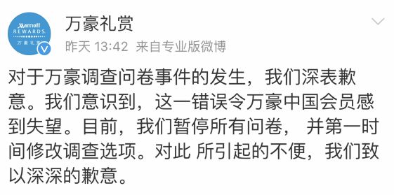 對于萬豪禮賞會員調查問卷的錯誤,我們深表歉意。在發現錯誤后,所有問卷調查已經被立即終止。