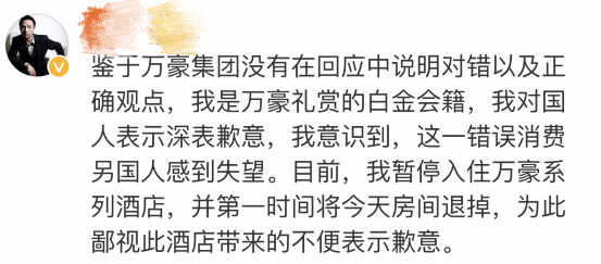 1月9日下午,@萬豪禮賞 對此事做出回應,向“中國會員”致歉:
