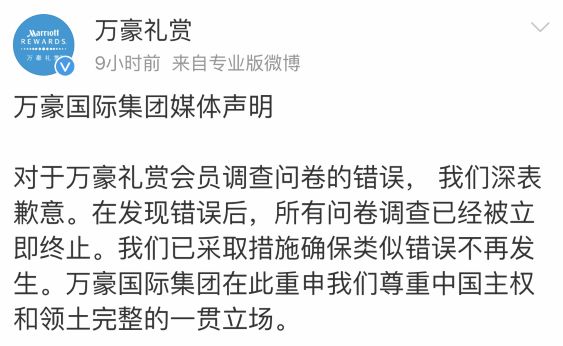 我們已采取措施確保類似錯誤不再發生。萬豪國際集團在此重申我們尊重中國主權和領土完整的一貫立場。