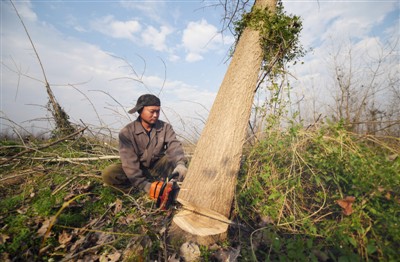 2017年11月27日,南洞庭湖自然保護(hù)區(qū)核心區(qū)內(nèi),一名工作人員在清理歐美黑楊。 新華社記者 李 尕?cái)z