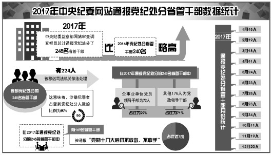 《法制日?qǐng)?bào)》記者逐條梳理中央紀(jì)委監(jiān)察部網(wǎng)站審查調(diào)查欄目信息統(tǒng)計(jì),該欄目在2017年總計(jì)通報(bào)黨紀(jì)處分了248名省管干部,比2016年黨紀(jì)處分省管干部240名的數(shù)量略高。