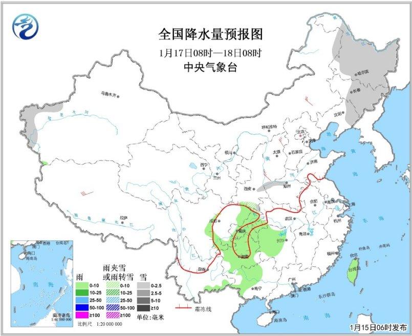 17日08時至18日08時,新疆西部、東北地區大部等地有小雪;貴州大部、重慶大部、廣西西部、臺灣島等地有小雨或陣雨。內蒙古東部、華北西部等地有4~6級風。南海西南部海域將有7級、陣風8級的大風。