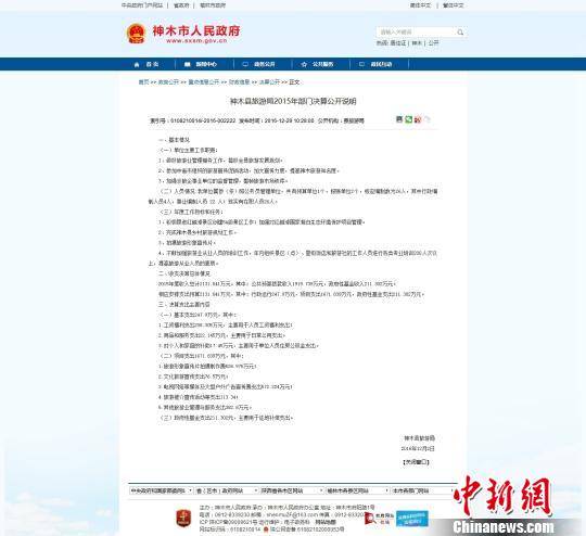 神木旅游局2015年部門決算公開說明。網頁截圖