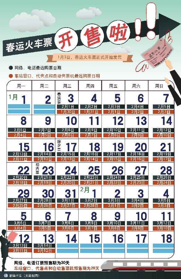 根據(jù)往年春運出行特點,初五至初八是返程高峰期。網(wǎng)絡、電話訂票預售期為30天,因此22日至25日將迎返程票搶票高峰。