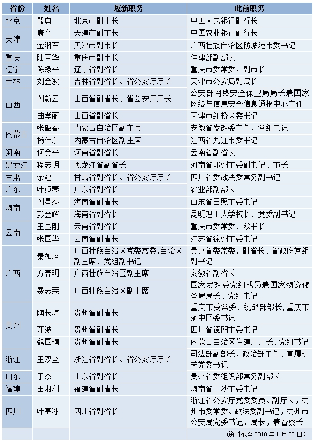 新華網(wǎng)北京1月24日電(記者陳淑君 李志強)2018年省級地方兩會大幕開啟,多地黨政領導班子近日迎來密集調(diào)整。1月19日到23日,重慶、廣西、甘肅等地省級黨委常委班子成員陸續(xù)調(diào)整,北京、天津、內(nèi)蒙古、遼寧等十九省區(qū)市28位省級政府副職履新。