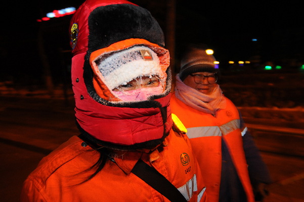 1月23日,在黑龍江省牡丹江市西安區(qū),環(huán)衛(wèi)工們完成晨掃,帽子上結著霜花。新華社發(fā)(張春祥 攝)