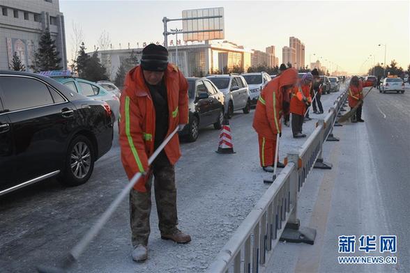 內(nèi)蒙古自治區(qū)呼倫貝爾市冬季漫長。12月22日,環(huán)衛(wèi)工人在道路上清雪除冰。新華社記者 劉磊 攝