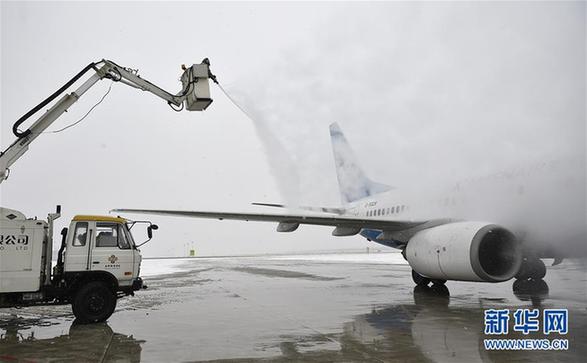 1月4日,銀川河東國際機場機務人員對飛機進行除冰作業(yè)。新華社記者 王鵬 攝