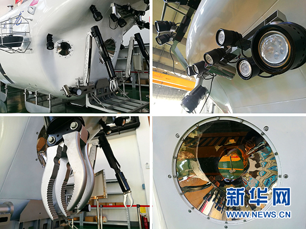 這是國家深海基地潛水器試驗水池車間內(nèi)等比例“蛟龍”模型各部分細節(jié)(拼版照片,2017年12月19日攝)。新華社記者 李紫恒 攝