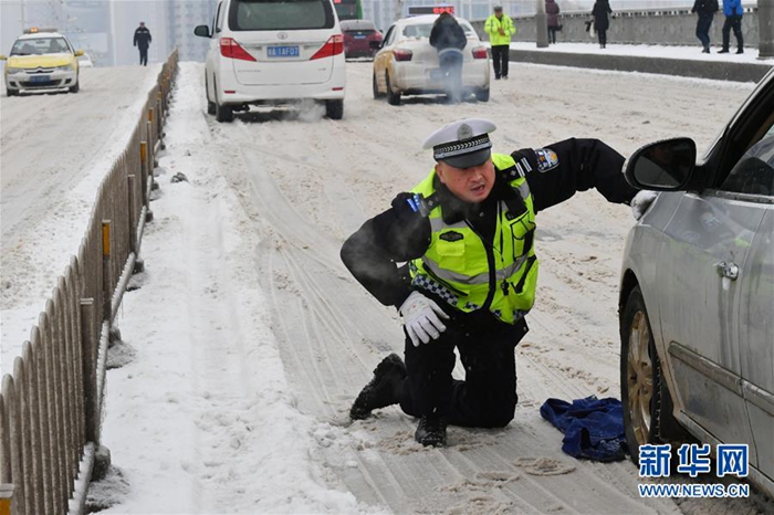 1月27日,在湖北省武漢市江漢一橋橋面,民警將衣服鋪墊在雪地上協助推車。新華社發(金思柳 攝)