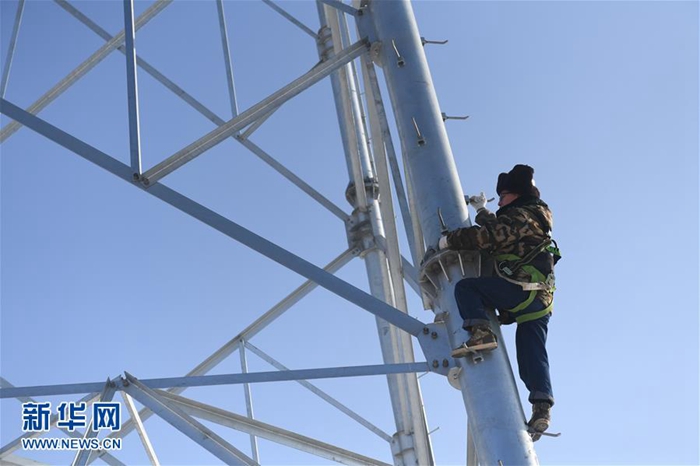 1月26日,國家電網長春供電公司輸電運檢室帶電作業班班長楊忠武徒手爬上高壓線塔。新華社記者 張楠 攝
