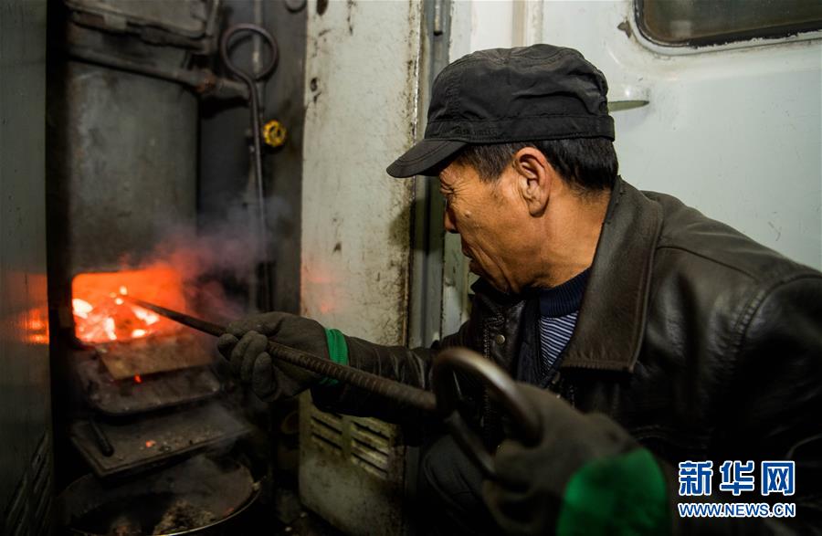 在從通遼發(fā)往集寧南的6042次列車上,鍋爐工人宋德格在給車廂鍋爐加煤(1月27日攝)。新華社記者 連振 攝