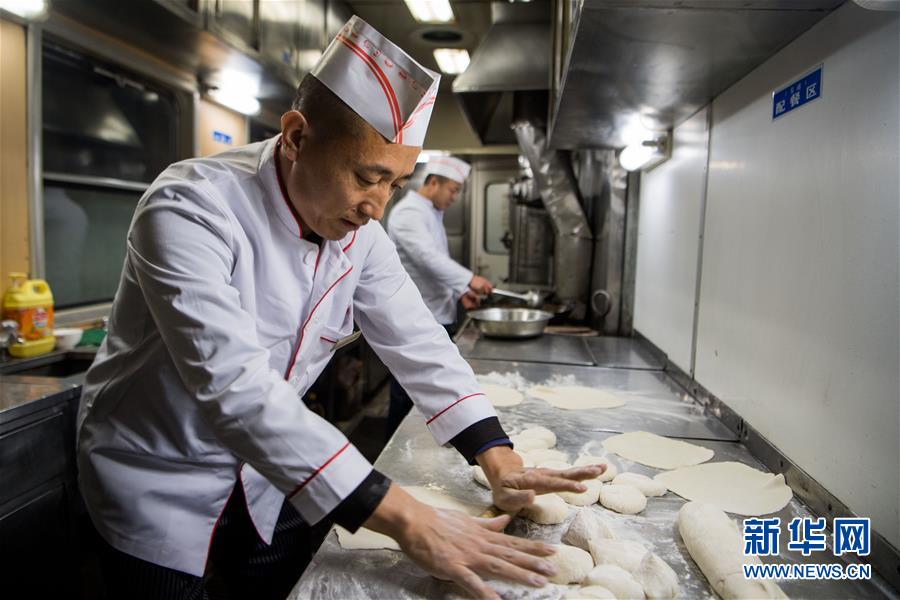 在從集寧南發(fā)往通遼的6041次列車上,廚師侯志勛(前)在制作面餅(1月24日攝)。新華社記者 連振 攝