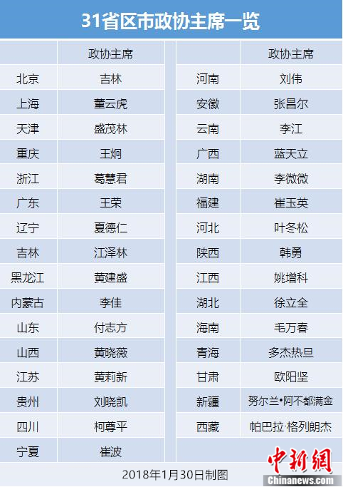 省級(jí)政協(xié)一把手迎來(lái)新官上任的包括上海、河北、江西、黑龍江、安徽、天津、湖北、甘肅、河南、福建、云南、浙江、海南、江蘇、內(nèi)蒙古、重慶、山西、貴州、廣西、青海、吉林、山東、寧夏。