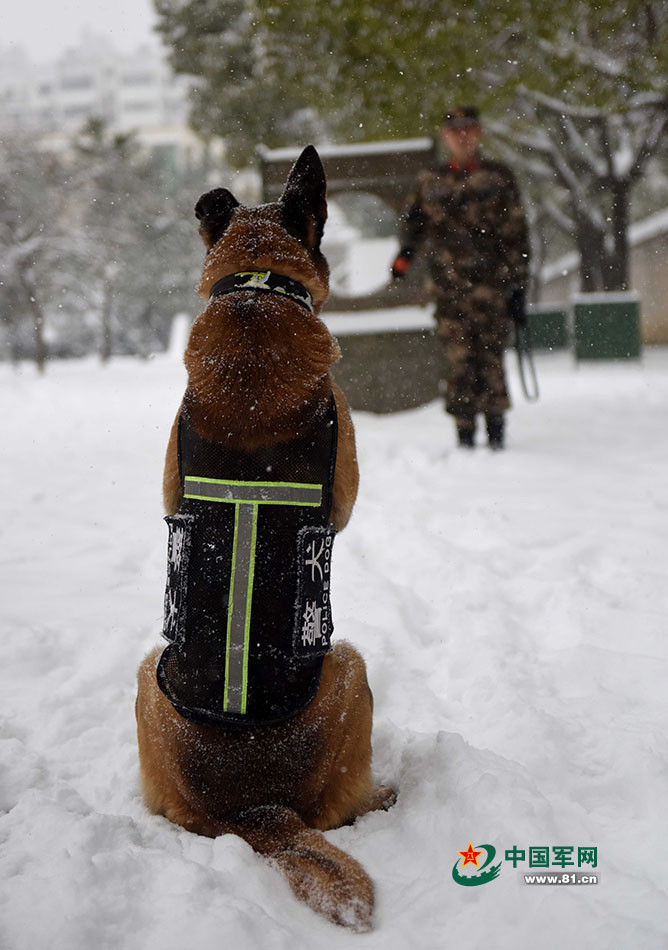 1月27日,武警安徽總隊機動支隊警犬班班長王營廣帶領(lǐng)警犬“魯克”進行坐臥立等服從性訓(xùn)練。