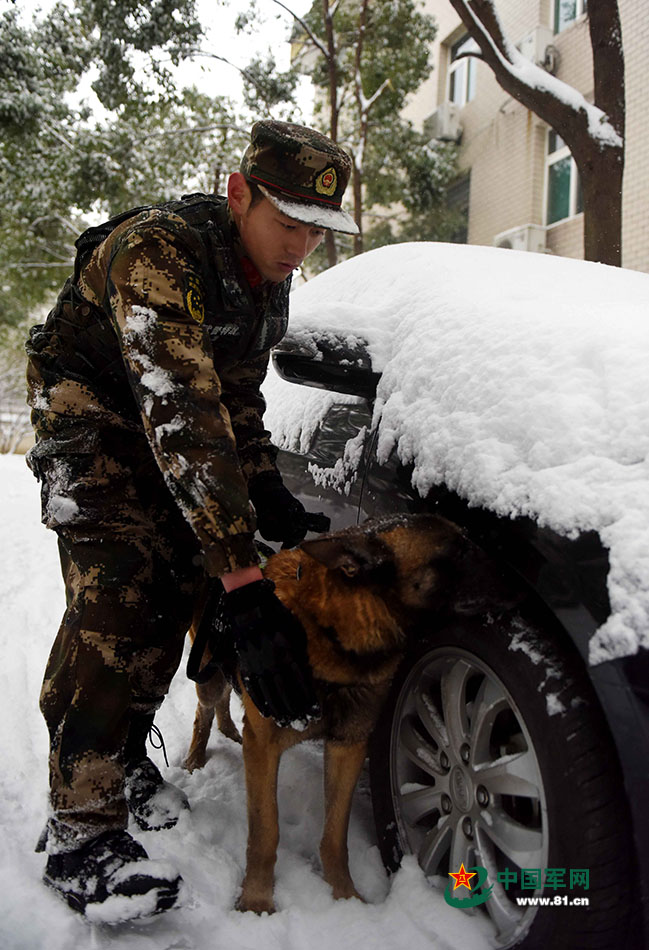 1月27日,武警安徽總隊機動支隊警犬班班長王營廣帶領警犬“魯克”進行車輛搜爆訓練。