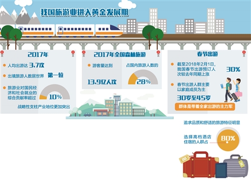 眾信旅游發布的數據顯示,截至2月1日,春節出游預訂人次較去年同期上漲30%。中國旅行社協會對外發布的《2018春節黃金周旅游趨勢報告》顯示,2018年春節期間,在旅游消費持續升溫的情況下,春節全家出游成為越來越多人的選擇,旅游過年人數有望創歷史新高。