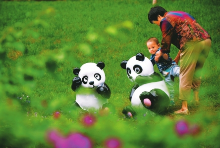 2月3日,冬日的陽光明艷無比,成都三環(huán)路嬌子立交至航天立交外側(cè),濃密的樹叢里,一條灰磚小道在草地里蜿蜒。周圍散落的是各種熊貓的雕塑,有彩色的,也有用植物打造的。