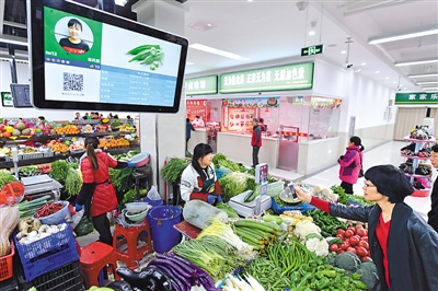 安徽省合肥市瑤海區勝利智能農貿市場,每個攤位都安裝了電子屏,只需掃碼即可實現移動支付,還可在平臺對商家進行點評、維權投訴等。掃碼“滴”聲之后,現實與虛擬被連接,這種黑白方格組成的“時代符號”(二維碼)帶來了便利、快捷和驚喜。 張大崗攝(新華社發)
