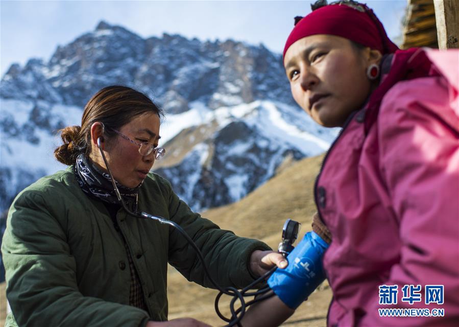 巡診隊里唯一的女醫(yī)生張紅英(左)在為牧民檢查身體(2017年12月18日攝)。新華社記者 江文耀 攝