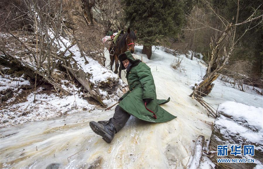 巡診隊醫(yī)生葉力夏提從一處冰坡滑下(2017年12月21日攝)。 新華社記者 江文耀 攝