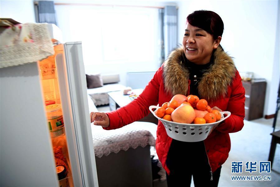 盧氏縣東明鎮(zhèn)小灣村貧困戶趙愛文在新搬遷的家里從冰箱取水果招待客人(2月1日攝)。新華社記者朱祥 攝