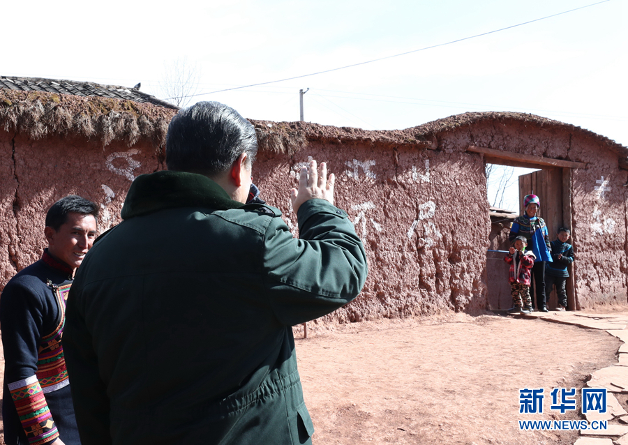 這是2月11日上午,習近平在涼山彝族自治州昭覺縣三岔河鄉三河村考察時同村民打招呼。 新華社記者 鞠鵬 攝