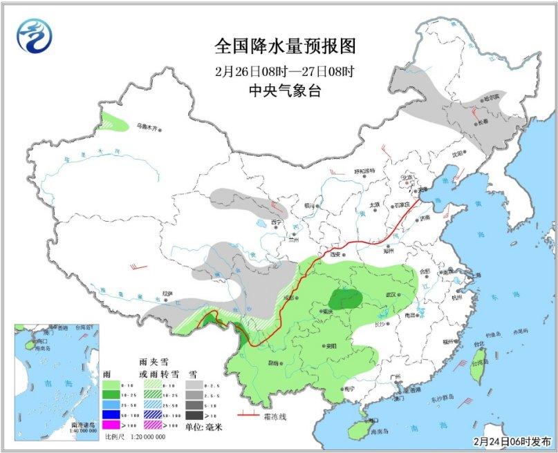 24至25日,西南地區(qū)東部、江漢、江淮、江南大部、華南等地有小到中雨。26日夜間起,南方地區(qū)將自西向東出現(xiàn)一次中到大雨過程。