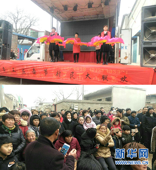 拼版照片:上圖為,2月21日,河北任縣象王莊舉行“春節村民大聯歡”;下圖為,“春節村民大聯歡”吸引眾多村民觀看。新華網發
