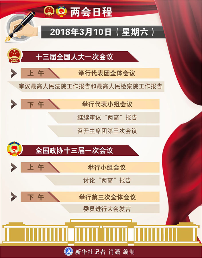 新華社北京3月9日電 十三屆全國人大一次會議10日上午舉行代表團全體會議,審議最高人民法院工作報告和最高人民檢察院工作報告。下午舉行代表小組會議,繼續審議“兩高”報告,召開主席團第三次會議。