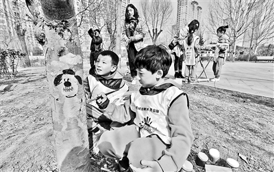 在植樹節(jié)即將到來之際,史家小學五年級4班和二年級17班的二十余名同學來到朝陽區(qū)泛海國際社區(qū)的中心花園,為這里的一棵棵小樹“穿上花衣”。