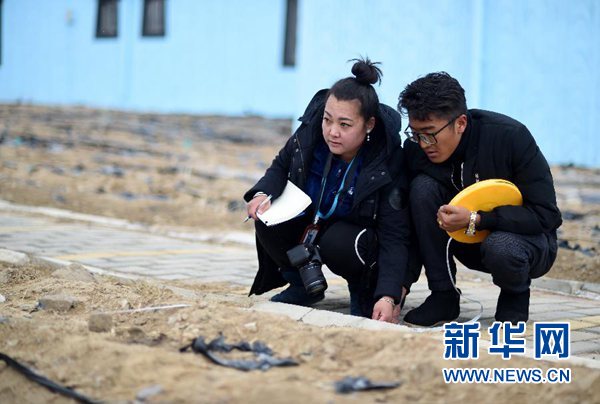 索朗央吉(左)與村干部測量房前屋后的地,準備種植玫瑰、牧草等(3月6日攝)。新華社記者 覺果 攝