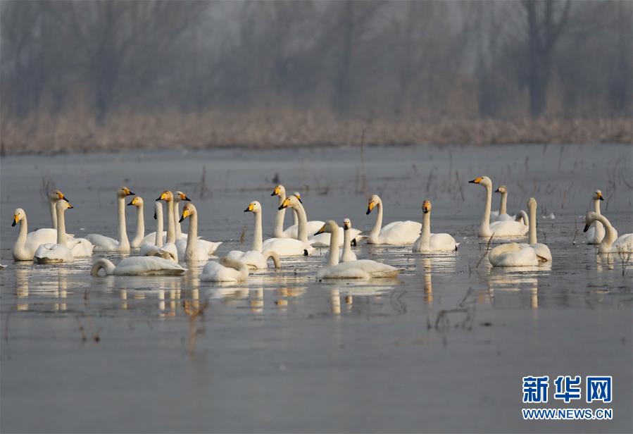 3月14日,一群天鵝在河北省懷來縣官廳水庫覓食。近年來,河北省懷來縣大力實施官廳水庫上游水生態濕地保護與修復工程項目,河岸防護林等生態工程,使水庫及周邊自然環境與水質得到了極大改善,成為天鵝等候鳥的理想中轉站和棲息地。新華社記者 楊世堯 攝