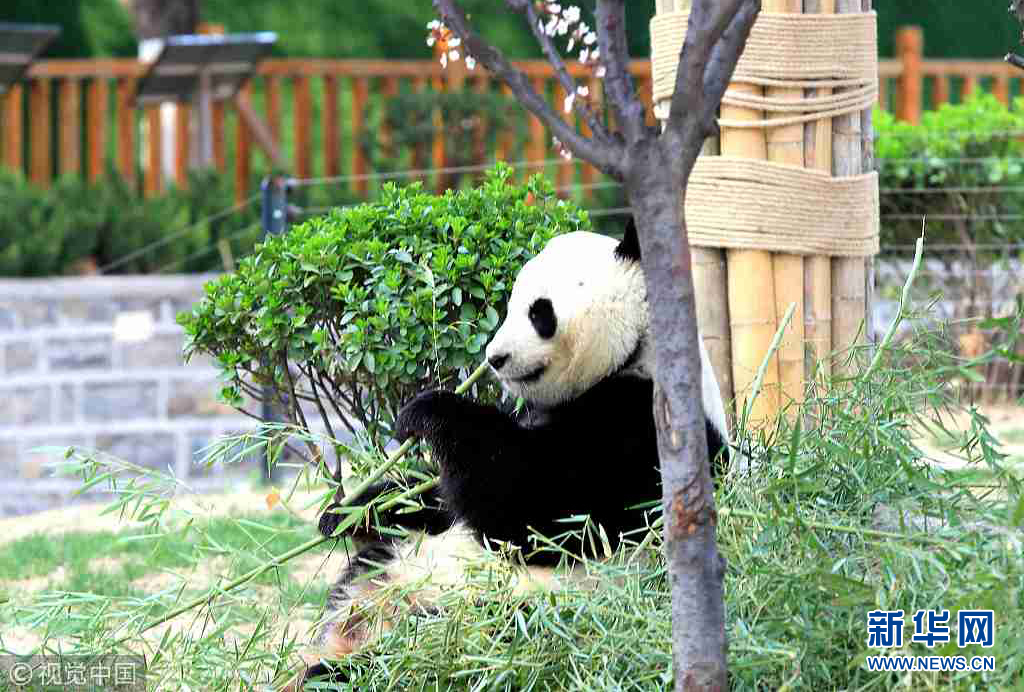3月27日,山東濟(jì)南春暖花開,動物園內(nèi)熊貓?jiān)趫@中散步吃美食享受春天美好陽光。(圖片來源:視覺中國)