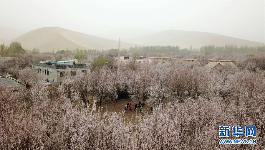 3月28日,游客在敦煌鳴沙山下的李廣杏園內(nèi)賞花。近日,甘肅省敦煌市鳴沙山下8000多畝李廣杏花競相開放,吸引了眾多游客和市民踏青賞花。 新華社記者陳斌攝