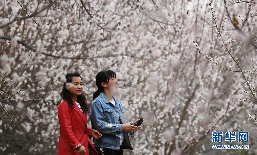 3月28日,游客在敦煌鳴沙山下的李廣杏園內賞花。近日,甘肅省敦煌市鳴沙山下8000多畝李廣杏花競相開放,吸引了眾多游客和市民踏青賞花。 新華社記者陳斌攝