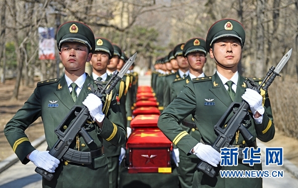 3月28日上午,中韓雙方在韓國仁川國際機場莊嚴舉行第五批在韓中國人民志愿軍烈士遺骸交接儀式。民政部副部長高曉兵率代表團出席交接儀式,中韓雙方代表現場簽署交接書,確認交接20位中國人民志愿軍烈士遺骸及相關遺物。中方現場舉行悼念儀式后,中國駐韓國大使邱國洪為志愿軍烈士遺骸覆蓋國旗,隨著高曉兵副部長“祖國接你們回家!”的呼喚,全體中方人員向志愿軍烈士三鞠躬,中國人民解放軍禮兵護送烈士遺骸登上空軍專機,啟程,回國。解放軍空軍專機進入中國領空后,兩架戰斗機全程護航,用空軍特有的方式向志愿軍烈士致敬。專機抵達后,組織實施了莊重的迎接儀式。